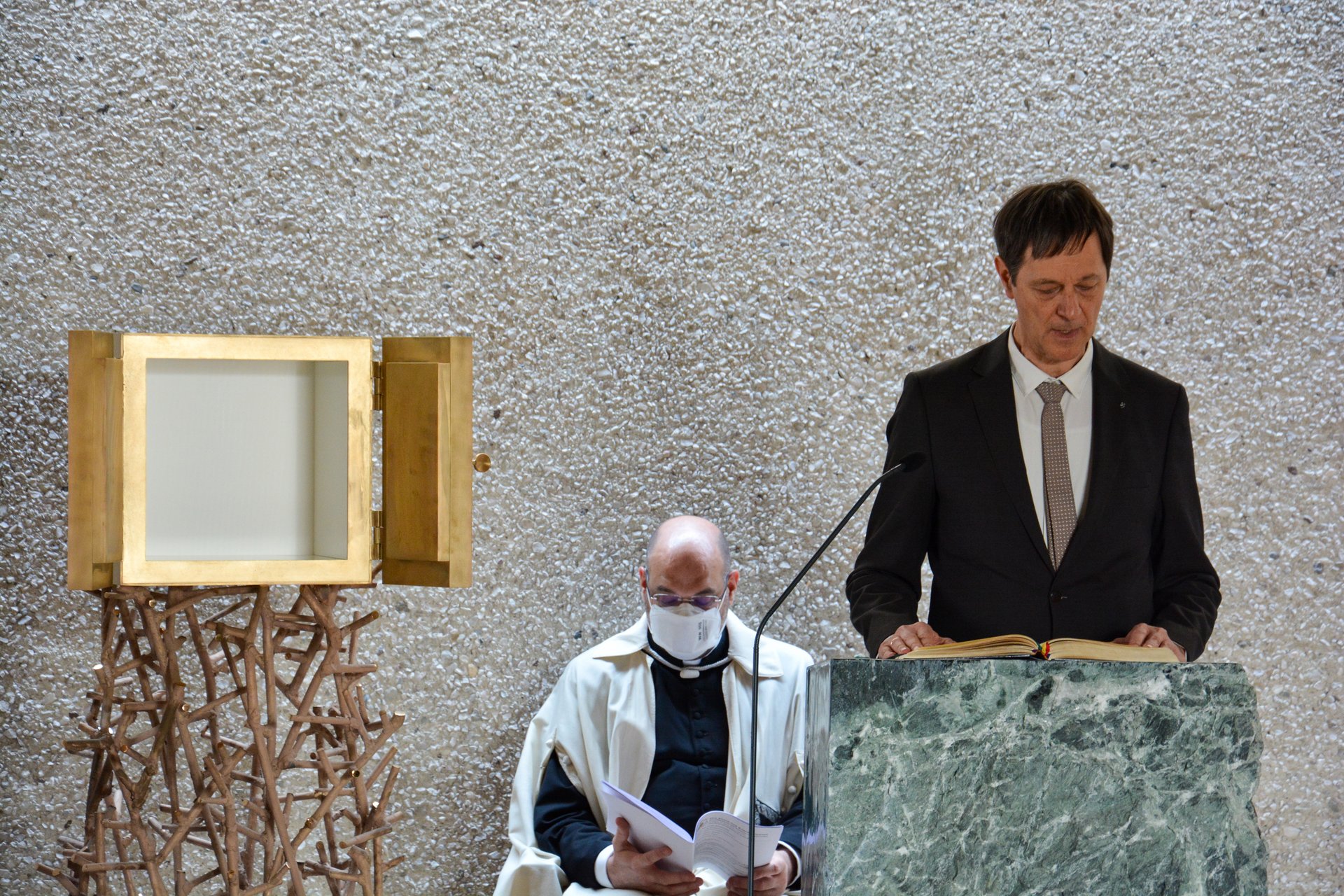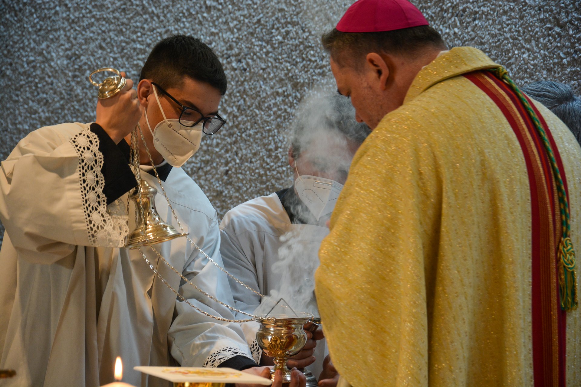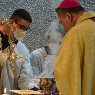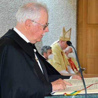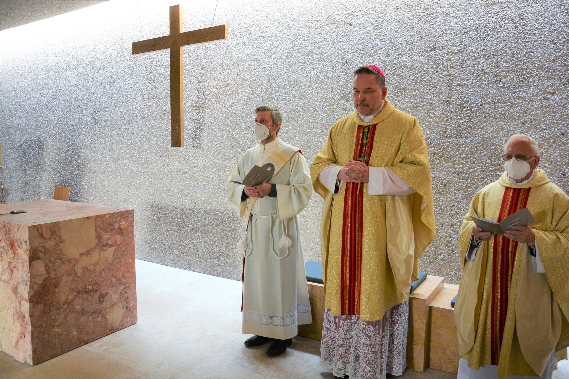 Nach dem Reinigen wurde der Altar für die Eucharistiefeier gedeckt. Althochmeister P. Prior Arnold Wieland und Dekan Hans Pamer konzelebrierten. Beim musikalisch gestalteten Pontifikalamt mit dabei waren Zeremoniar Florian Weber (persönlicher Sekretär des Hochmeisters), Pater Christof und Diakon Thomas Schwarz.